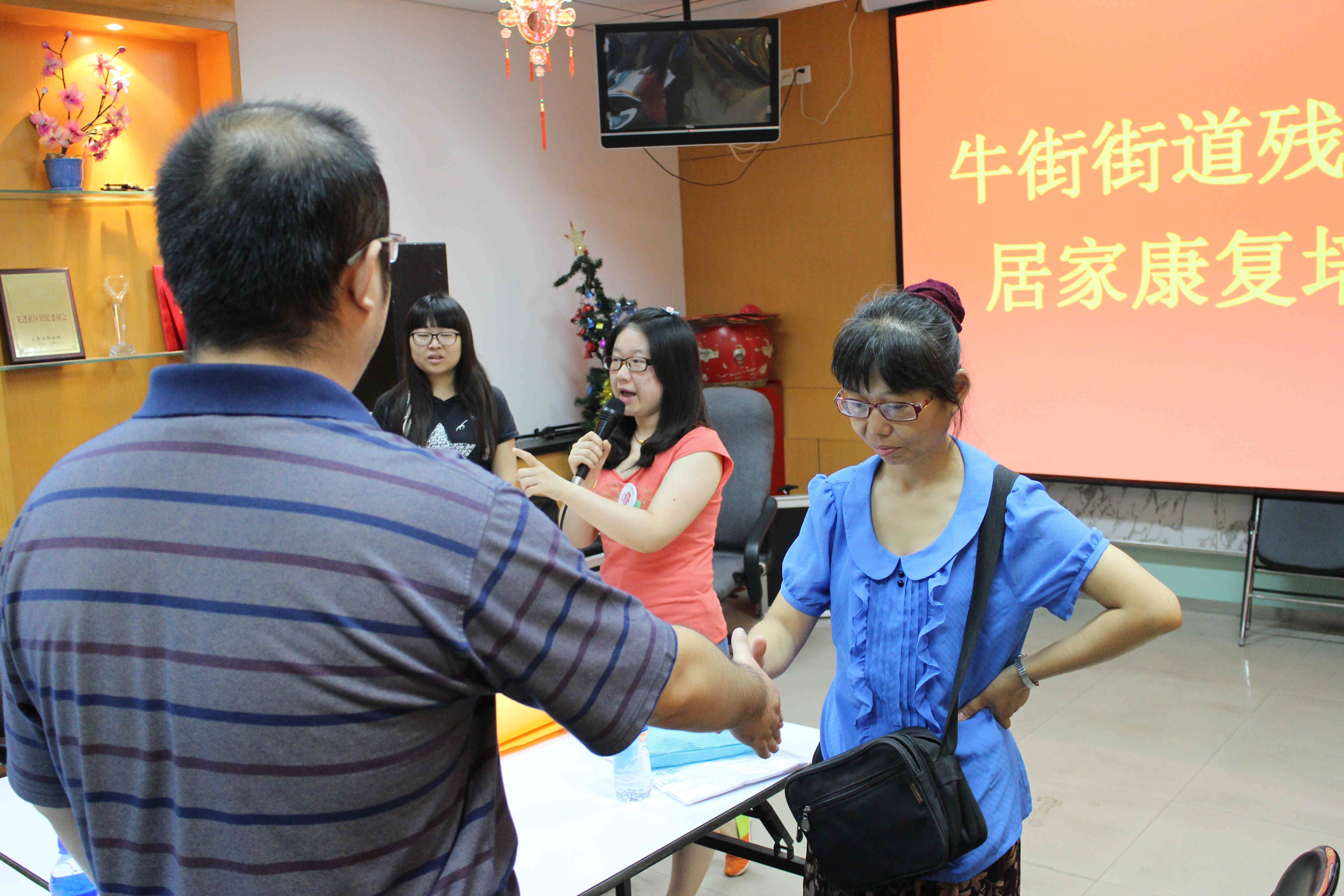 7月25日,牛街街道残联按照区残联统一部署,在辖区春风社区文体活动室举办了2014年精神居家康复活动。此次精神居家康复活动是区政府为民办实事项目之一,区残联聘请专业社工团队配合康复医生教授课程。第一次课程的主题为《团队的建立》,大家通过在彩纸上绘画出图案来介绍自己的名字,并相互熟识。在未来的七周中,街道每周都会举办一次精神居家康复课程。同时,精防大夫也会对家属进行六次专业培训。