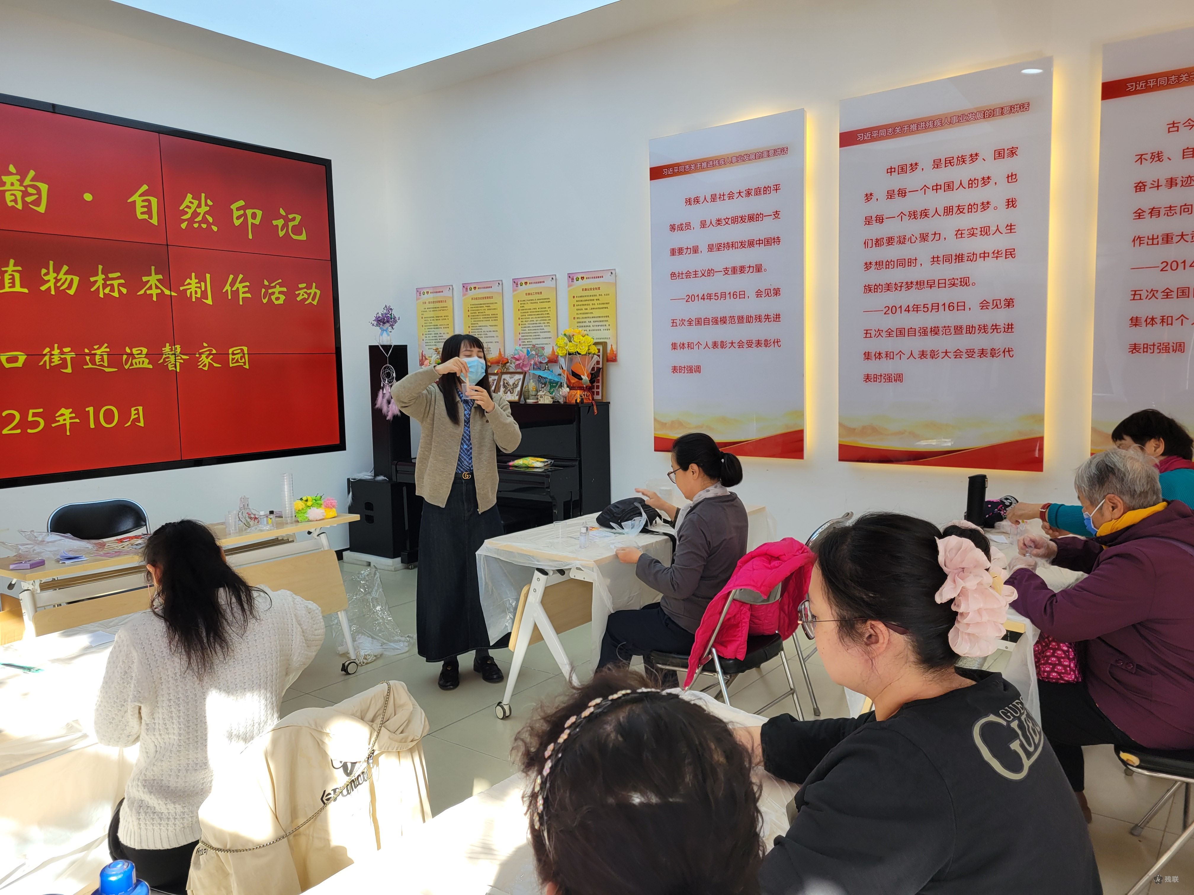 10月24日,新街口街道温馨家园开展“叶语花韵·自然印记”植物标本制作科普活动,40名残疾人朋友参与。活动通过植物知识讲解与标本制作实践相结合,帮助残疾人朋友感悟生命的多样性与生态的珍贵。