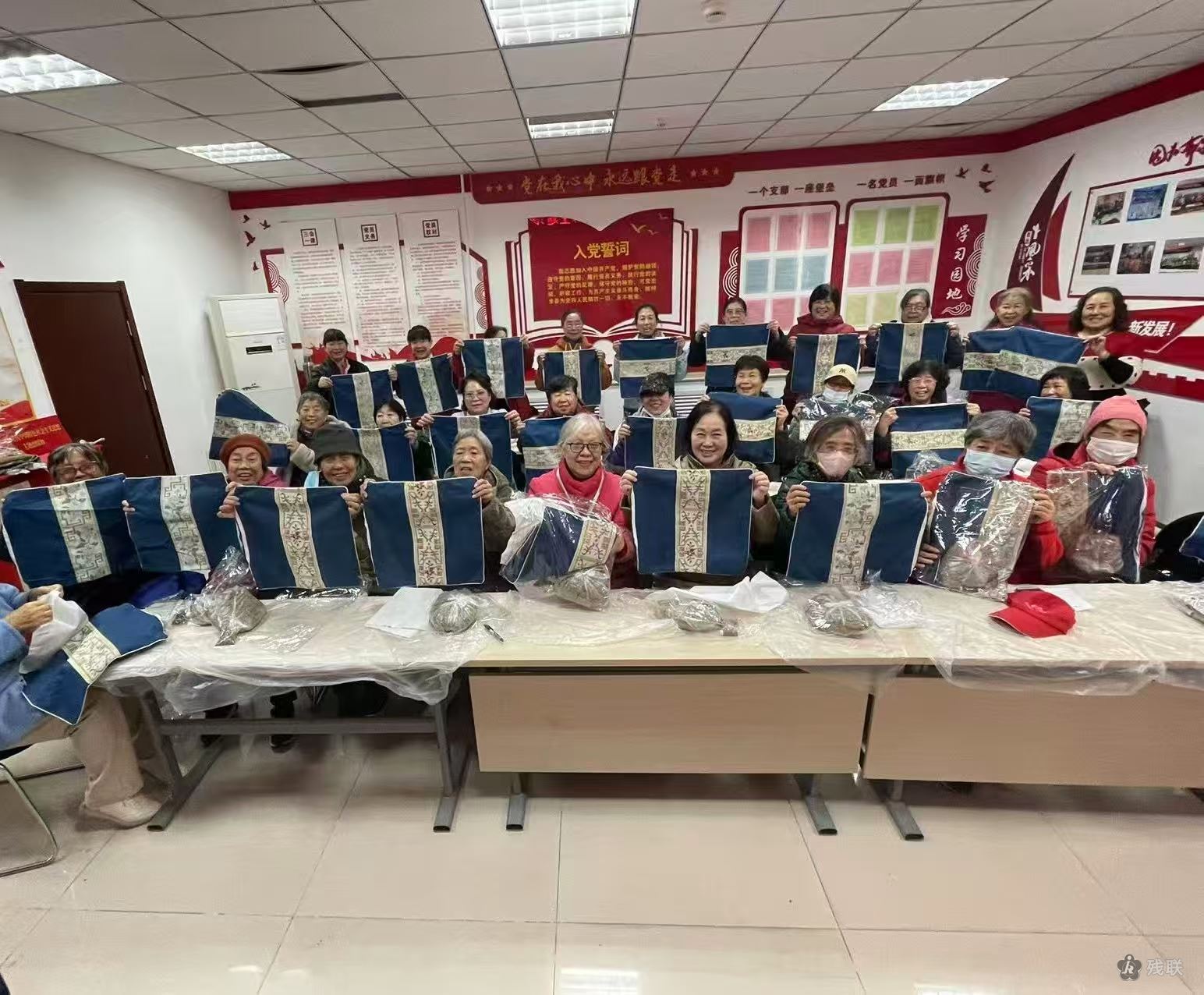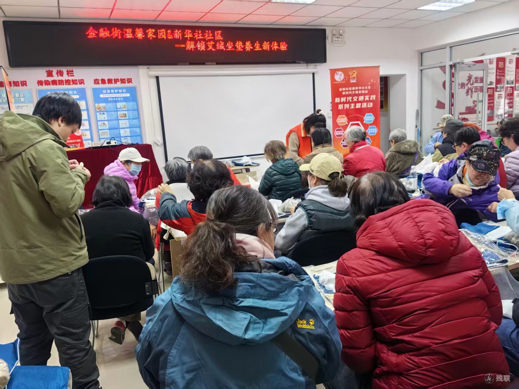 活动吸引残疾人、老年居民及养生爱好者参与。志愿者们提前备齐了干燥的艾叶、纯棉布套、针线等材料,专业养生讲师首先为大家科普了艾绒的养生原理:艾绒作为艾草经反复晒杵、捶打、筛除杂质制成的纯阳之物,通过体温激发其温热效应,可借助“内病外治”原理改善局部血液循环、驱散体内寒气,对久坐人群的腰骶部不适等均有辅助调理作用。在手工制作环节,大家在志愿者的指导下有条不紊地进行操作:将细腻的艾绒均匀铺入布套,小心翼翼地穿针引线,亲手缝制专属的养生坐垫。
