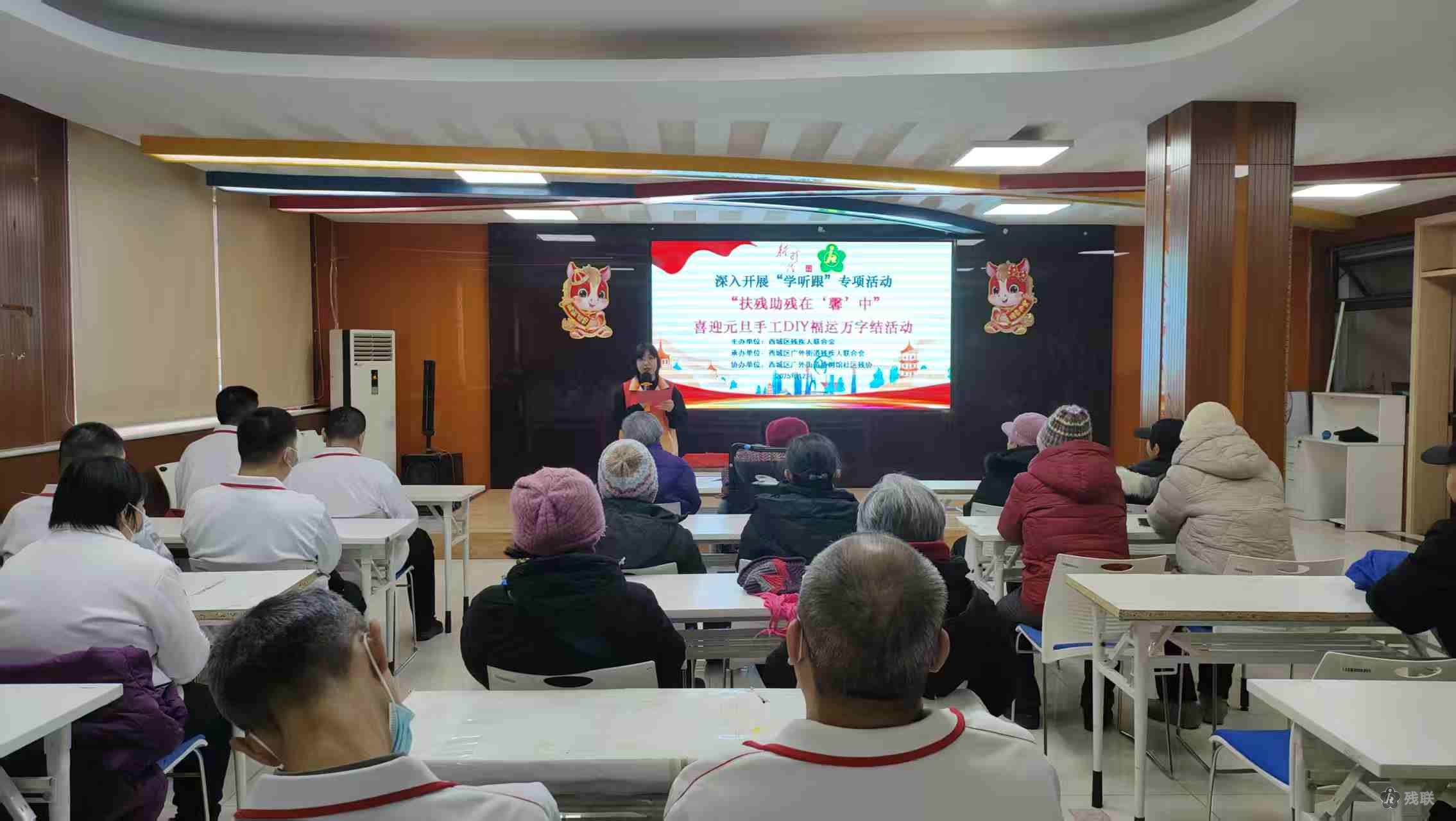 近日,在广外街道椿树馆社区新时代文明实践站,由西城区残联主办、广外街道残联携手椿树馆社区残协共同开展“扶残助残在‘馨’中”残疾人手工福运万字结活动,35位残疾人朋友热情参与。现场暖意融融,屋内充满了欢声笑语,桌上提前摆放着福运万字结材料,等待着大家的巧手装扮。残协专职委员与志愿者们精心布置现场,力求让大家都能感受到家一般的温馨与舒适。