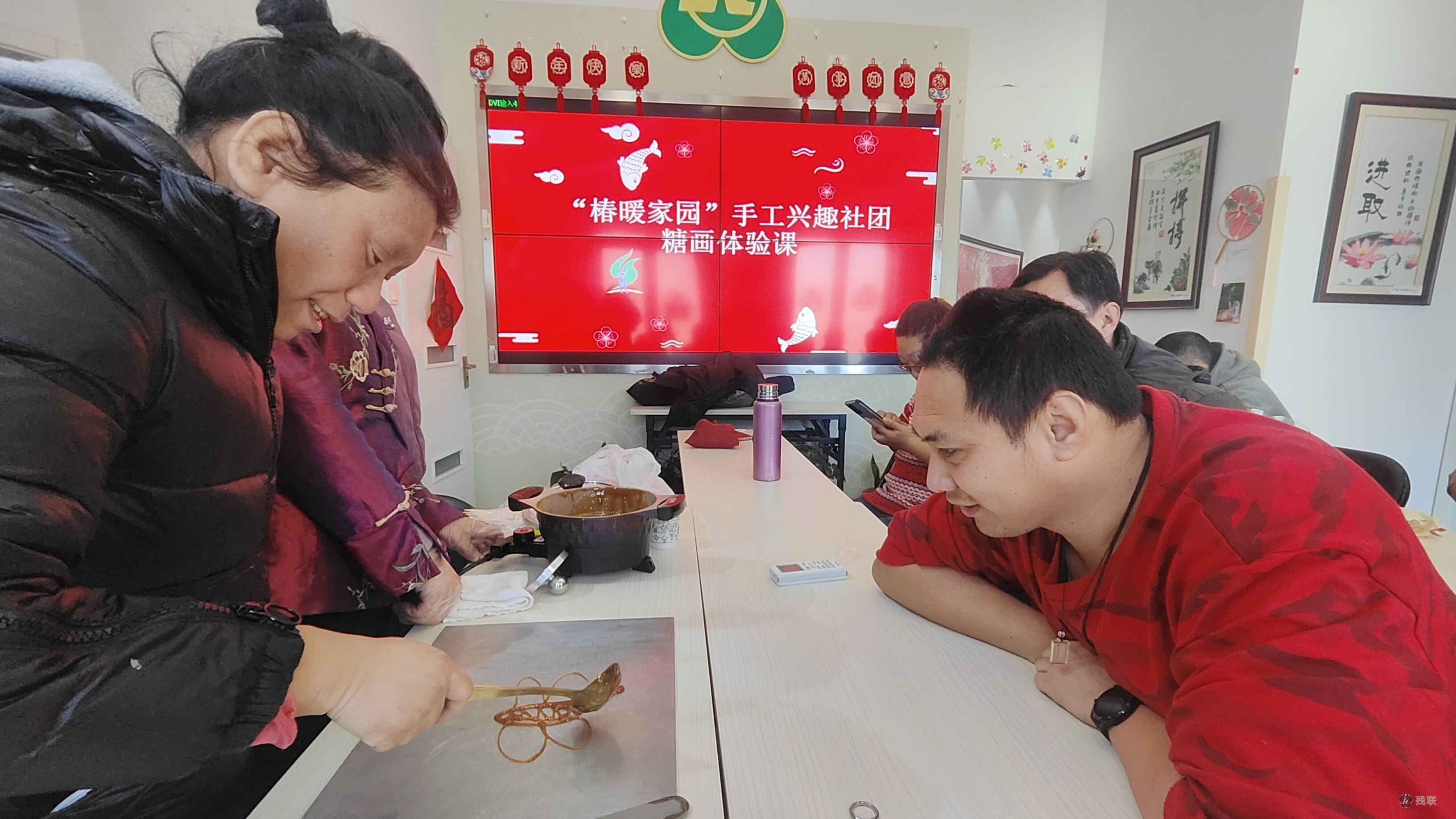 1月21日,椿树街道温馨家园“椿暖家园手工兴趣社团”牵头开展糖画体验课,十余名残疾人朋友齐聚一堂,在非遗传承人的专业指导下,沉浸式感受传统技艺的独特魅力,亲手解锁糖画制作的甜蜜乐趣。活动伊始,糖画老师细致讲解了糖画的历史渊源、核心制作技巧及安全注意事项,从糖稀熬制的火候把控到铜勺操控的力度掌握,每一个关键要点都讲解得清晰透彻。在志愿者的贴心协助下,学员们手持铜勺,舀起温热的糖稀,手腕轻转间,金黄的糖丝如金线般缓缓流淌、落地成形。尽管部分学员因身体不便,操控铜勺时略显吃力,但在老师的耐心点拨与反复示范下,大家始终专注投入、坚持不懈。从简单的糖丝拉花,到形态鲜活的小马、蝴蝶等生肖与昆虫造型,每一幅作品都凝聚着学员们的努力与执着。现场糖香萦绕鼻尖,欢声笑语此起彼伏,晶莹剔透的糖画在阳光下折射出甜蜜光芒,既温暖了冬日时光,更抚慰了每个人的心田。
