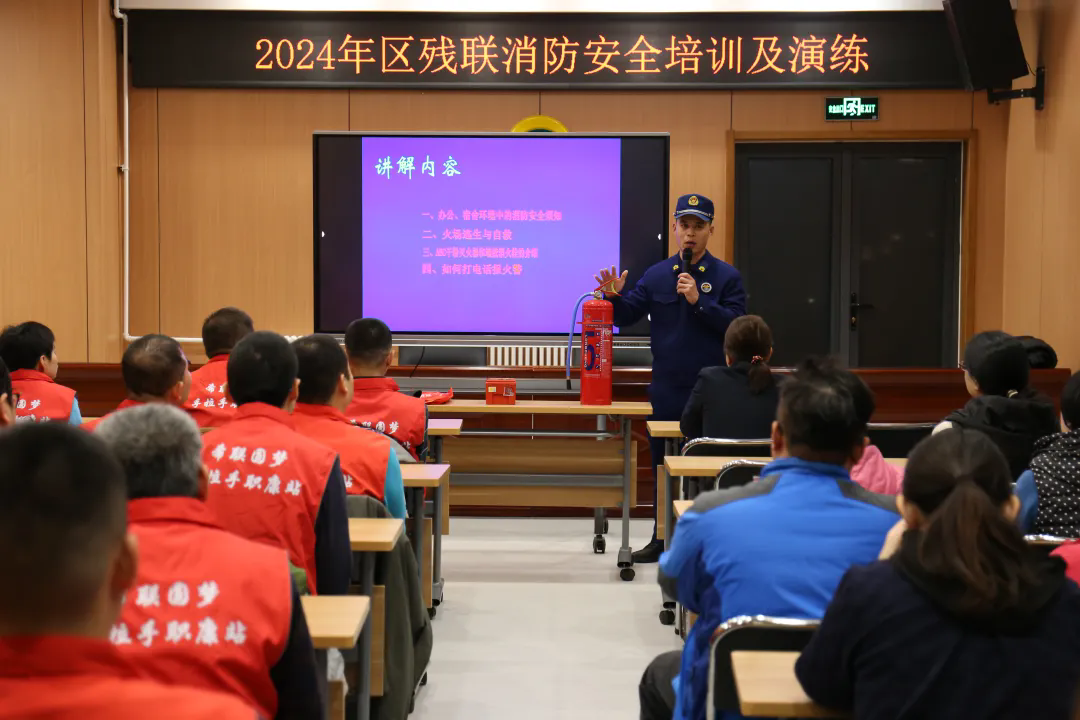 11月26日上午,西城区残联围绕全国消防日安全教育,以“全民消防 生命至上”为主题,邀请大观园消防站消防员举办消防安全知识培训,组织全体干部、区级职康站师生和区残疾人服务大楼物业人员开展逃生演练。