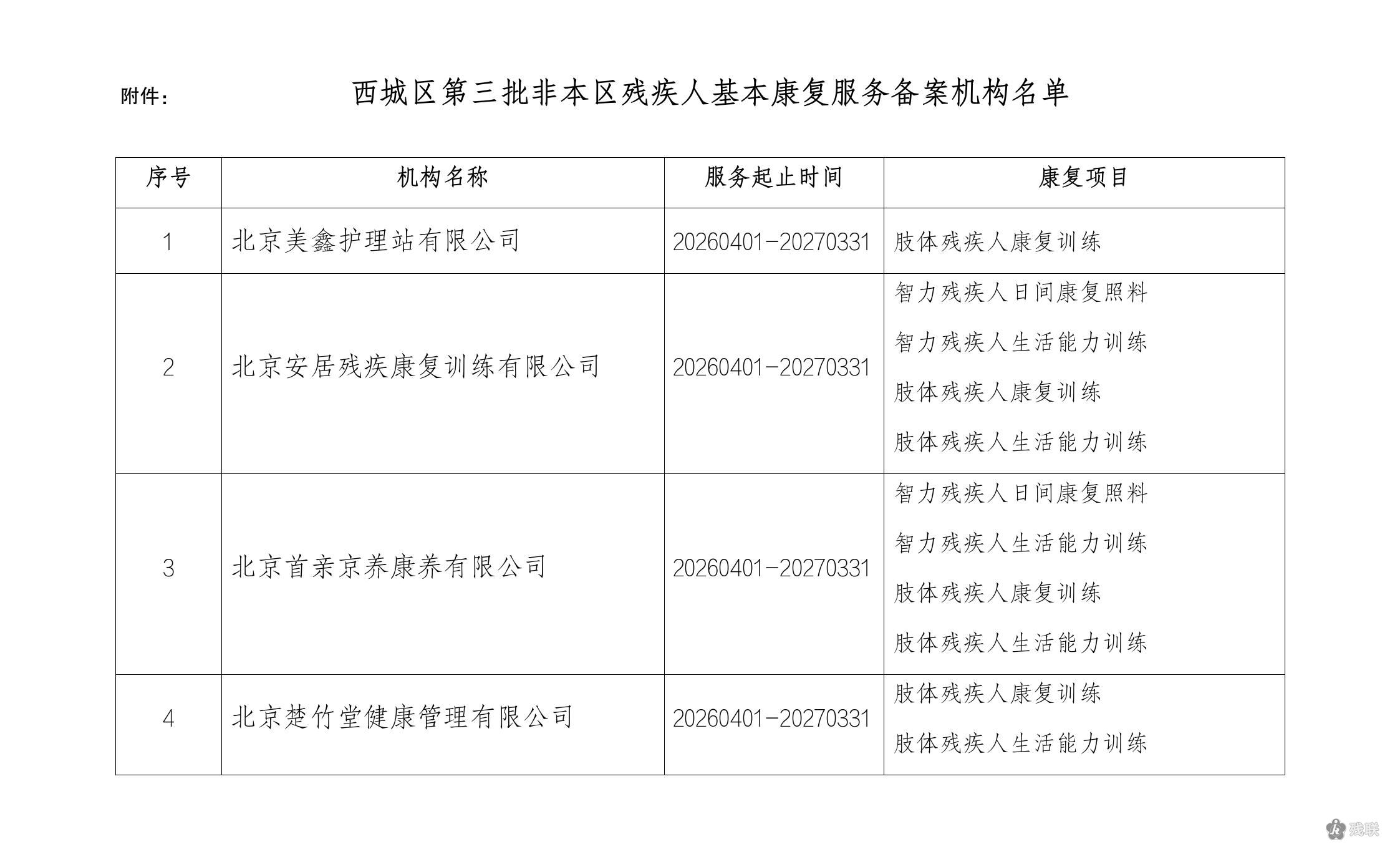 按照市残联《北京市残疾人备案康复机构协议管理办法》(京残发〔2024〕13号)文件精神,西城区残联于2026年3月组织开展了第三批非本区残疾人基本康复服务备案机构的评估认定工作,经各机构自愿申请、资格考察,并经区残联理事长办公会审议通过,将“北京美鑫护理站有限公司”等4家机构认定为西城区第三批非本区残疾人基本康复服务备案机构,服务有效期限一年,自2026年4月1日至2027年3月31日,现予以公告。