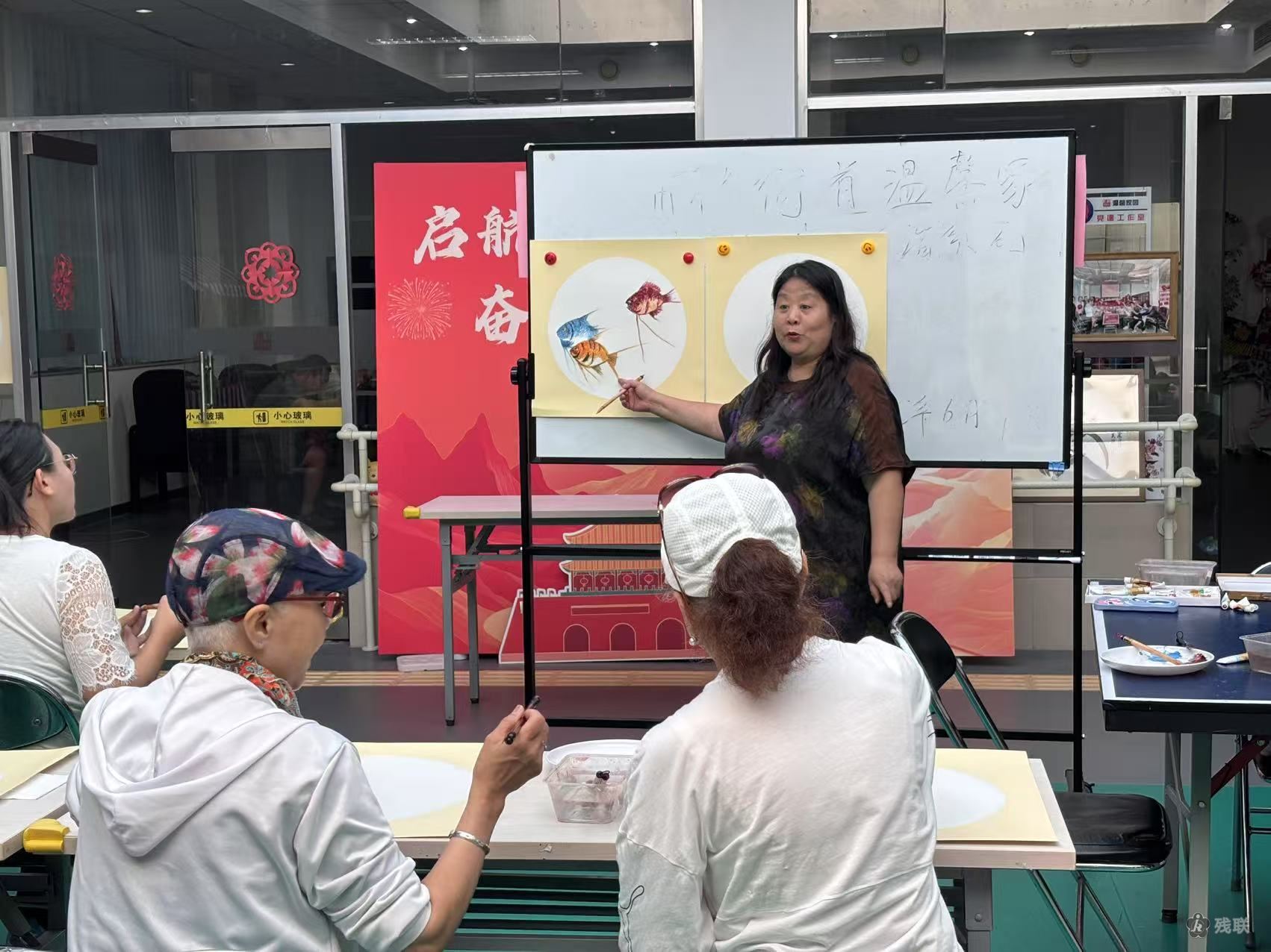 近日,大栅栏街道温馨家园开展国画剪纸系列课程。第八期课程以金鱼为主题,由牛老师进行现场示范教学。课程开始前,学员们积极交流学习期待。牛老师通过白板展示金鱼示范作品,逐步讲解绘画步骤,引导学员将金鱼形象呈现在画纸上。学员们充分发挥想象力,对金鱼的构图和位置进行了个性化调整。教学过程中,社工全程观察学员的创作状态,学员之间也相互学习借鉴。课程尾声,牛老师特别传授“点睛”技巧——通过白色颜料点缀鱼眼,使金鱼更显灵动。