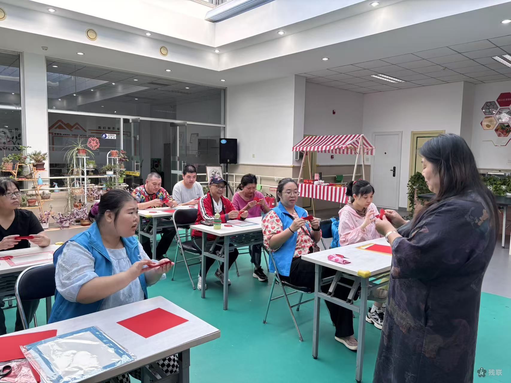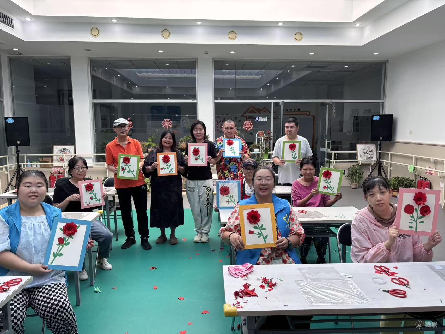 在大栅栏街道温馨家园,玫瑰象征着残疾人朋友们的热情与积极。为表达对社工老师的感恩之情,学员们提议在最后一次国画剪纸活动中学习制作立体玫瑰。牛老师将整束玫瑰分解为花瓣、花叶、花茎三部分进行讲解,随后指导学员完成折纸、修边、绘画和剪纸等步骤。在社工与学员的共同配合下,玫瑰作品被精心固定在相框中,形成一幅幅生动的画面。活动结束时,学员代表向牛老师赠送作品,感谢其专业指导和生活关怀。