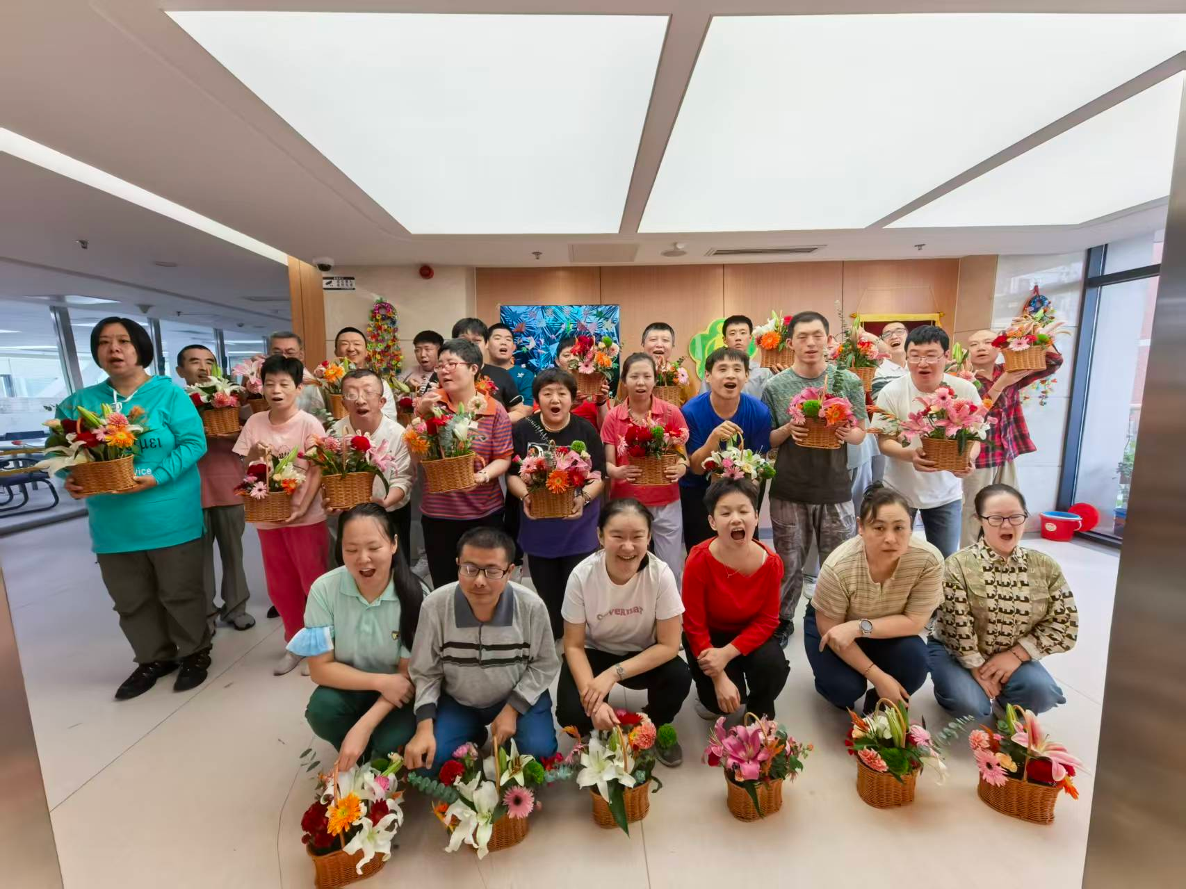 学员完成小花篮制作,互相欣赏作品,老师用镜头记录此时场景,照片中学员手持自制花篮。