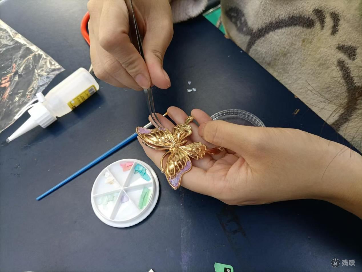 活动当天,残疾人朋友早早来到家园,满是期待。社工首先通过生动照片介绍,“以贝为墨、以光作笔”的螺钿瑰丽特色,称其为“可佩戴的东方瑰宝”。随后,大家跟着社工学习螺钿胸针制作步骤与注意事项,接着动手操作。现场不时传来赞叹:“您这个五光十色,太闪耀了!”“您这个原色加亮色,低调又出彩!” 很快,一枚枚漂亮的螺钿胸针被佩戴在胸前,在笑容映衬下更显耀眼。