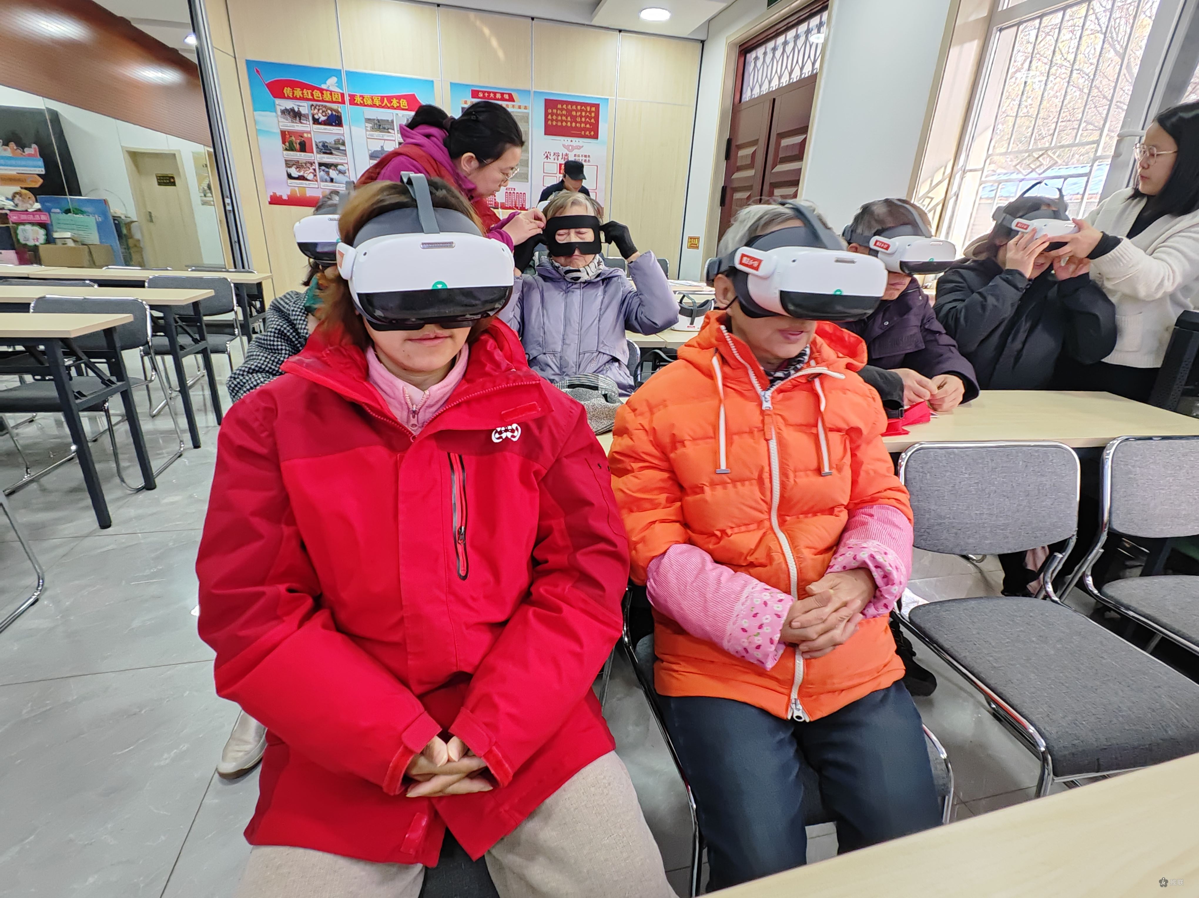 社区工作人员全程贴心陪伴,耐心协助调试设备、讲解历史背景,从VR设备的适配调整到党史细节的补充说明,每一处细致服务都让大家感受到“家门口”的温暖。