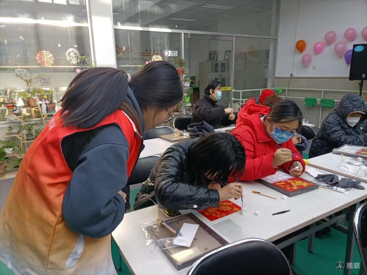 活动当天,残疾人志愿者早早抵达场地,满怀期待等候开启。社工热情欢迎大家的到来,以简明扼要的语言介绍了金箔画日历的制作流程,通过简单的剪裁、拼贴、压印,便能将金箔附着于画板之上,社工逐步示范制作步骤、细致讲解操作要领,带领每位残疾人朋友跟上节奏。此次活动助力残疾人朋友提升审美与手眼协调能力,增强社会参与感。