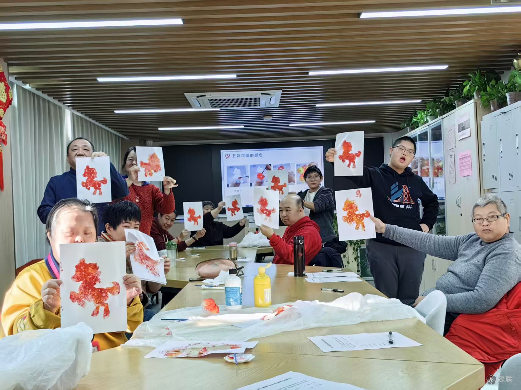 绘画环节中,老师提前备好画纸、画笔、颜料等工具,结合红色文化元素,为学员们讲解马匹的基本勾勒技巧、色彩搭配要点,用画笔描绘心中的红色骏马。学员们热情高涨,专注投入,认真临摹老师示范的图案,一笔一画间满是对新春的期盼。现场氛围温馨和睦,老师耐心指导每一位学员,学员们彼此交流心得、相互鼓劲,原本略显生疏的笔触,在一次次调整中逐渐流畅,一幅幅充满朝气的红色骏马画作渐渐成型。绘画间隙,工作人员将提前制作好的驴打滚逐一送到学员们手中,让大家带回家里慢慢品尝。软糯的糯米皮包裹着香甜的豆馅,承载着传统小吃的独特风味与职康站的暖心关怀。学员们手捧画作与这份甜糯心意,脸上洋溢着幸福的笑容。