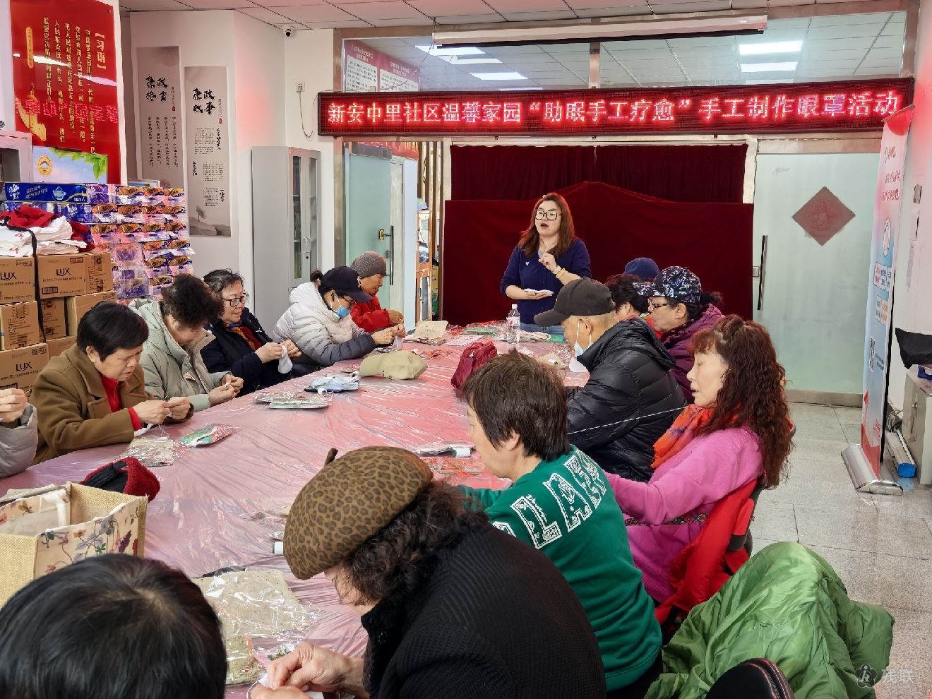制作环节中,社区温馨家园提前准备纯棉眼罩胚、中药包、针线等各类材料,药师现场示范缝制、填充、收口等步骤并答疑指导。大家兴致高涨,动手实践,交流技巧、互帮互助,现场药香萦绕、氛围温馨。